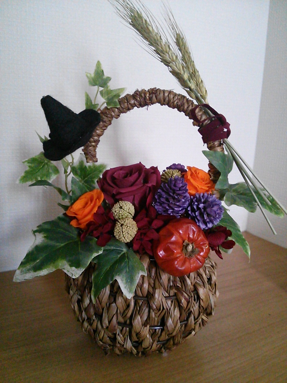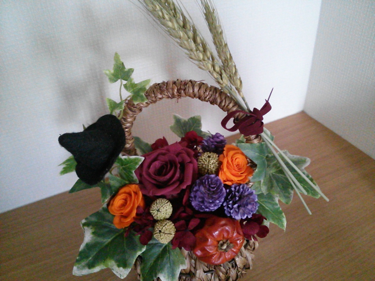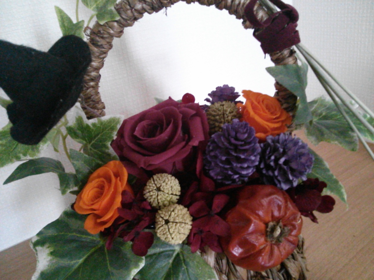 丸いかごにお花や実をアレンジしていますemoji
