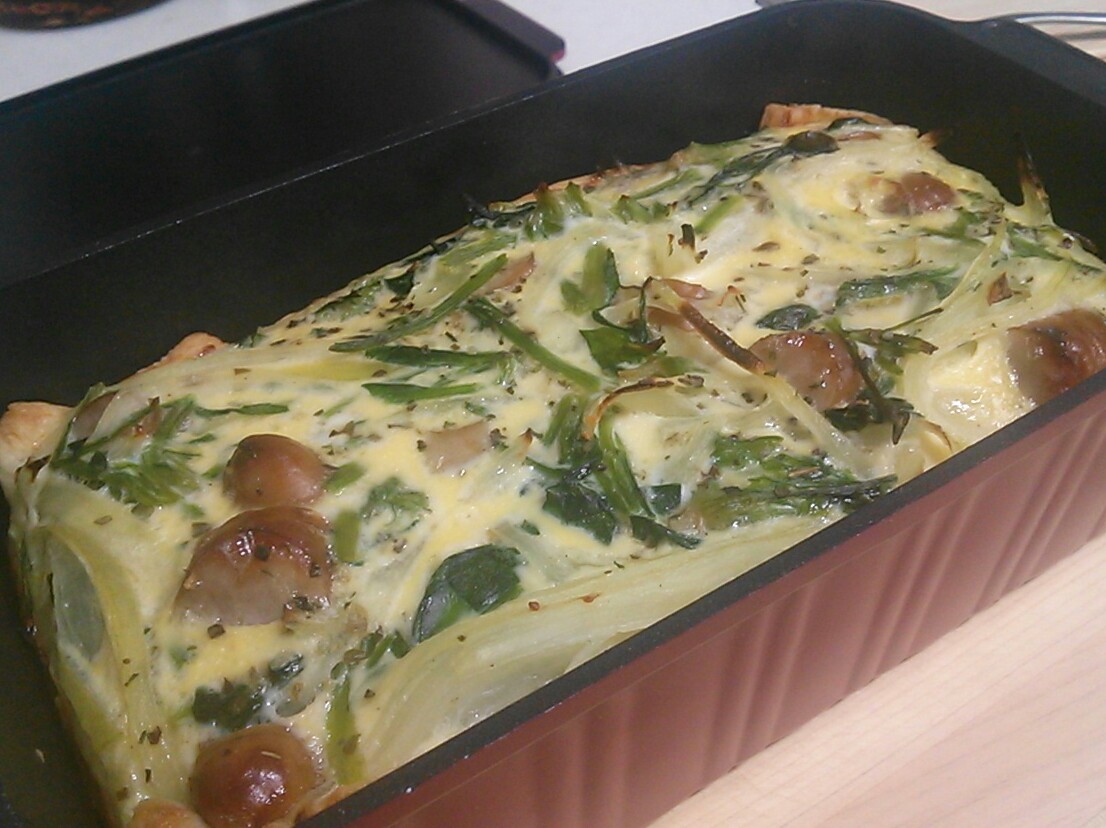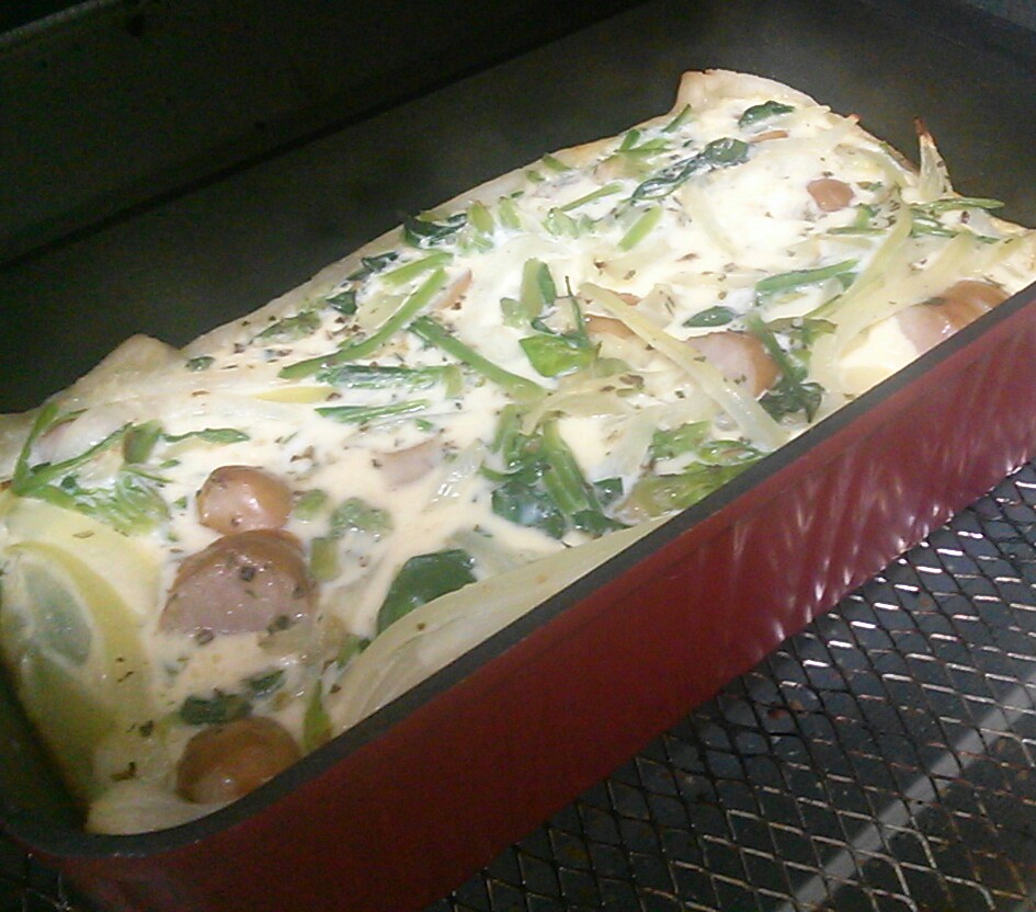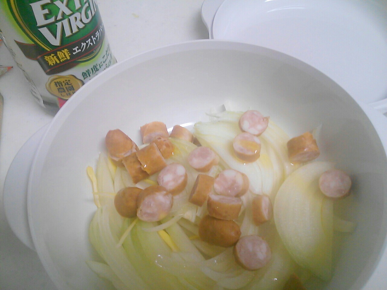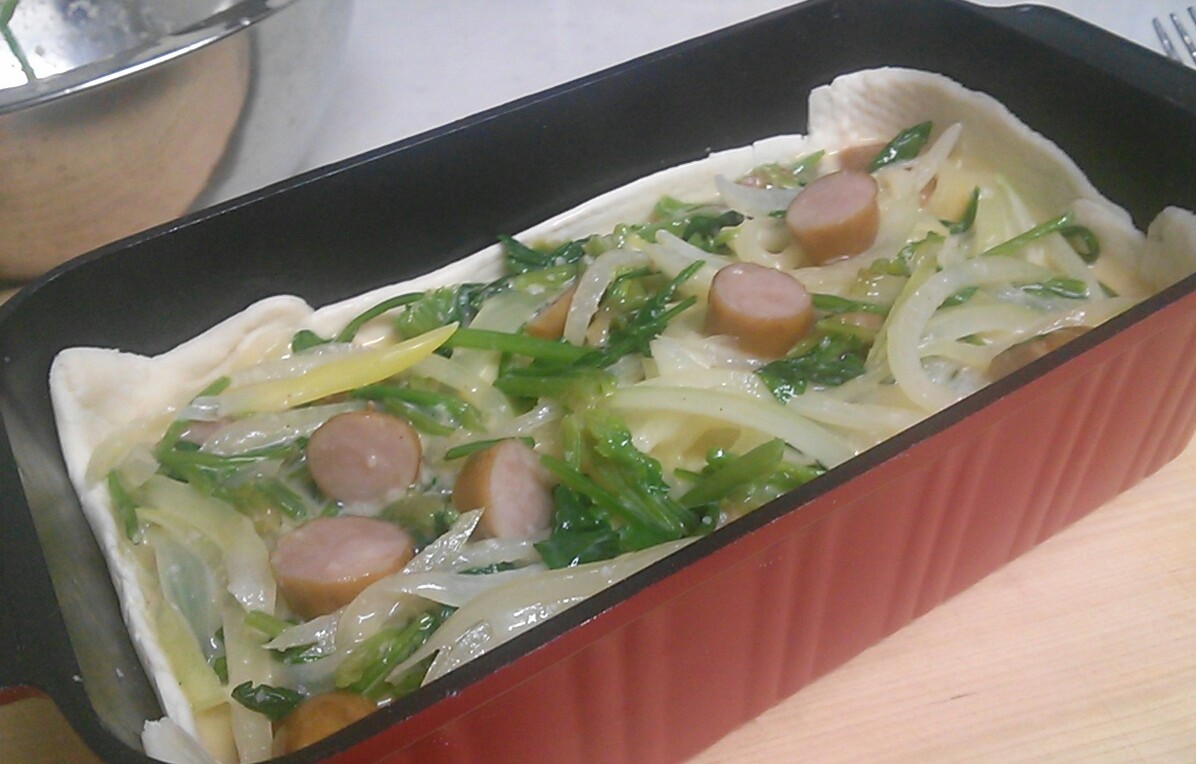 そこに、さました玉葱とウィンナー、ゆでたホウレン草を入れ、