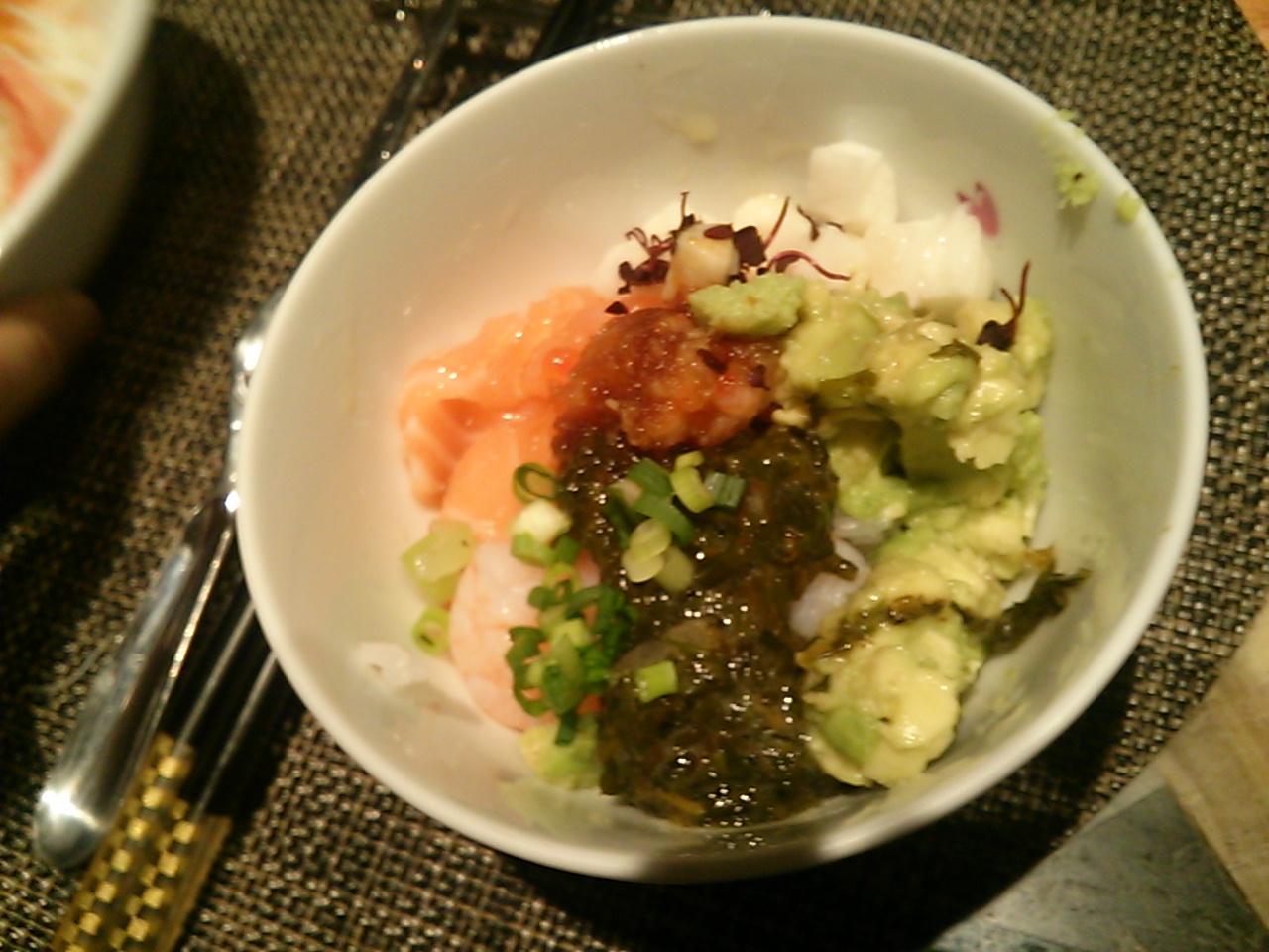 サーモン、イクラおろし大根、めかぶ数の子、えび、アボカド、長芋をご飯に好きなだけ載せて頂きます。