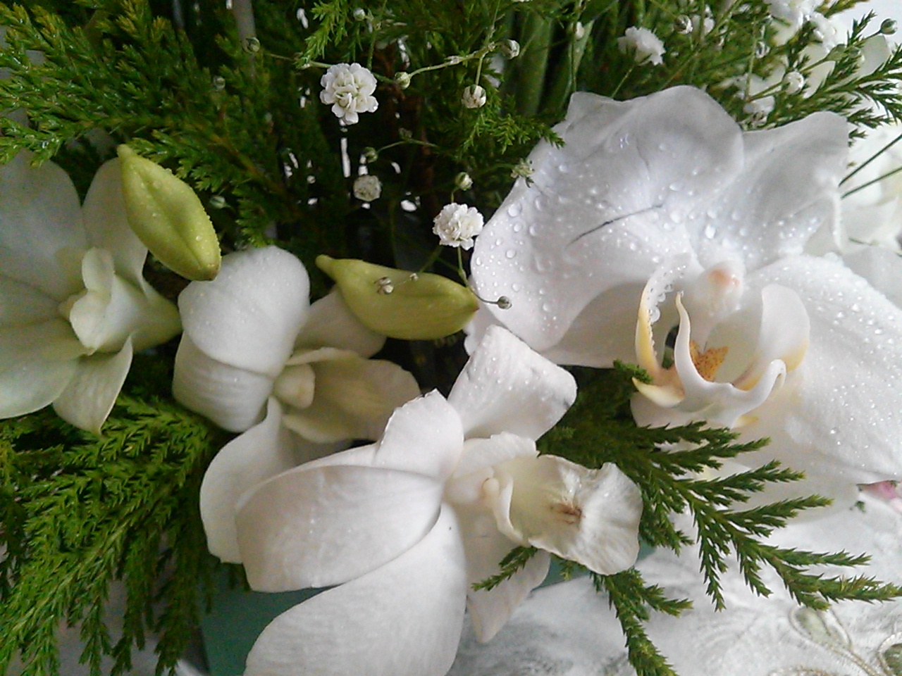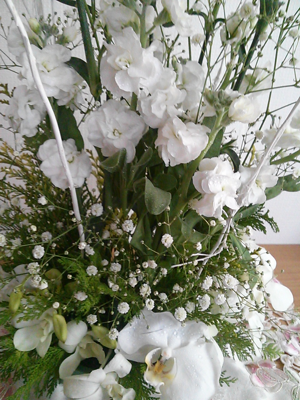 ガーベラ2本とカスミソウとサンデリアーナ(グリーンの葉)の束280円を購入。