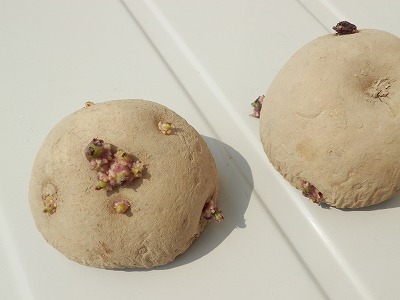 この前(3月16日)にじゃが芋の種イモを植えたのですが、今朝見たら、芽が伸びて、土から顔を出していました。